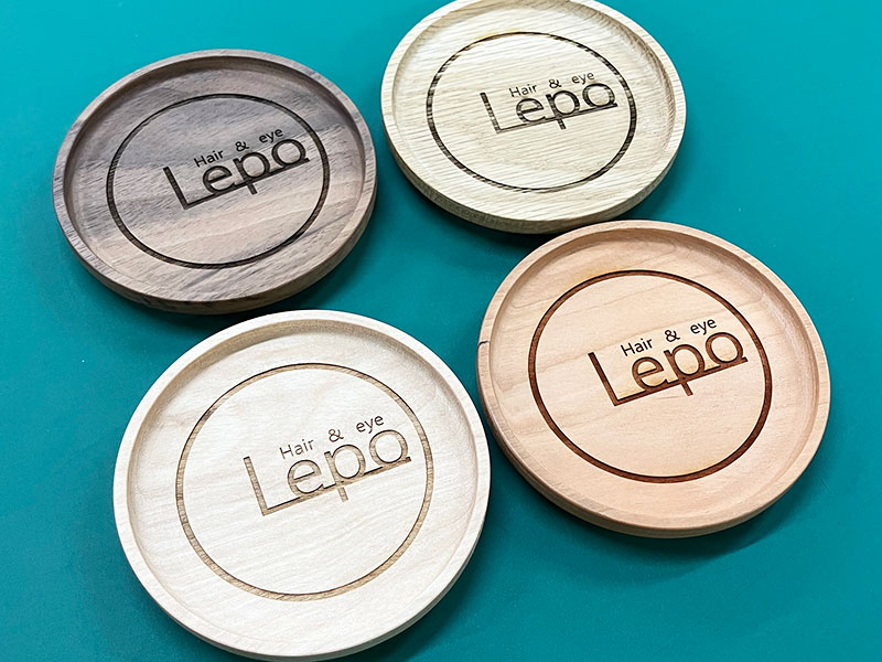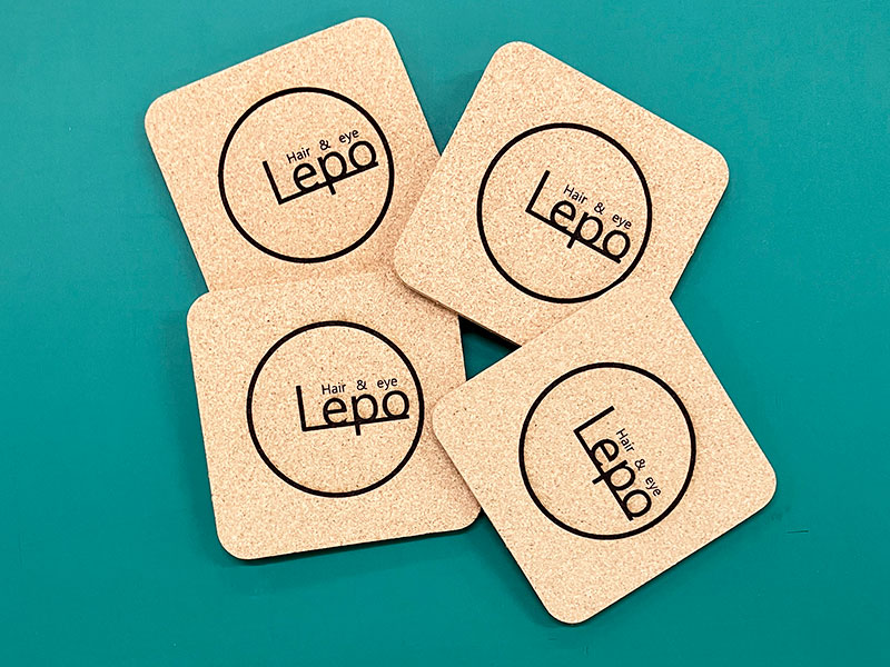 たくさんロゴ入りアイテム製作しプレゼントしました。山形の自然豊かな環境の中で癒しの空間を過ごせるなんて羨ましいです。マイナスイオン浴びまくりですね。木造の建物でより自然を感じる内装に合わせてプレゼントが何がいいか考えました。レーザー彫刻での表現が雰囲気に合うと思い木板やコルク等の素材でアイテム製作しました。