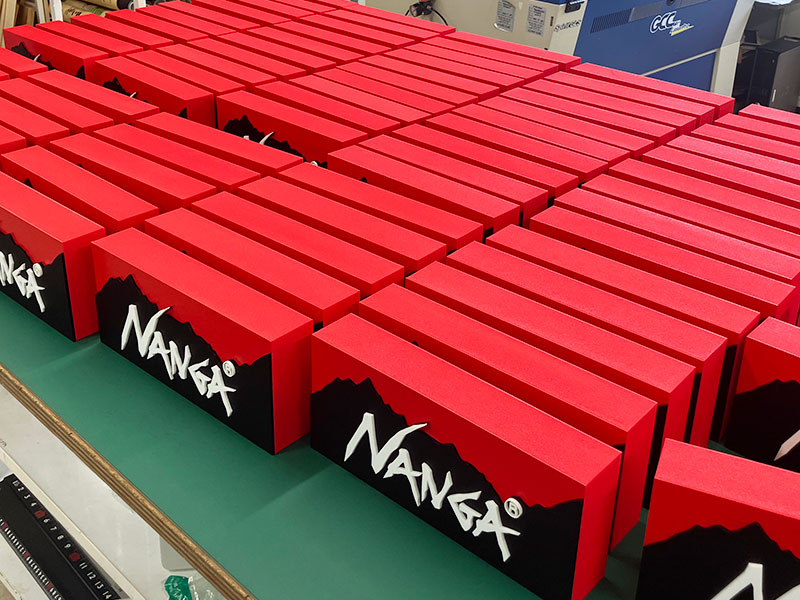ナンガ様からのカルプオブジェ製作依頼です。カルプ50mm厚に両面赤シート貼り加工し小口赤塗装のベースを作ります。その表面に黒と白のアクリルをレーザーでカットしたロゴを貼り合わせていきます。カット加工は機械ですが、シート貼り・小口塗装とアクリルの貼り合わせは手作業で1個ずつ仕上げていきます。