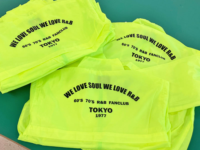 蛍光黄色のジャンパー支給にてプリント加工しました。薄いシャカシャカ生地へのプリントです。タグにはプリントOKと加工可能な場所の記載が丁寧に記載がありました。このタグがあるだけで安心して作業できました。20枚くらい揃うと目が眩しい★☆ 蛍光色目立つ‼さらにおそろいのプリントで団結感‼最高ですね。